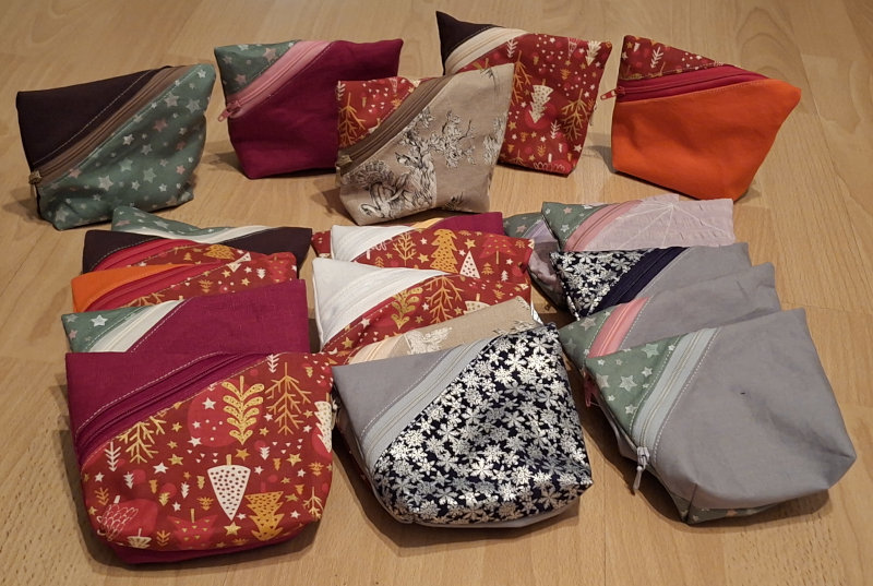 Futter gibt es im Gegensatz zum Original nicht und ich habe immer zwei Taschenteile aus zusammenpassenden Stoffen zugeschnitten, die Schräge durch beide Lagen im „Freischnauze“ Winkel zugeschnitten und dann immer zwei gegengleiche Taschen genäht. So konnte ich wieder gut Reststoffe aufbrauchen und mit Weihnachtsstoffen kombinieren. Der schräge Reißverschluss ist nicht nur optisch ein interessantes Detail, sondern ermöglicht eine sehr große Öffnung. Das ist bei einer Kosmetiktasche/Kulturbeutel (die Anleitung umfasst unterschiedliche Größen) praktisch, aber natürlich auch im Kekse ein Weihnachtssüßigkeiten einzufüllen.