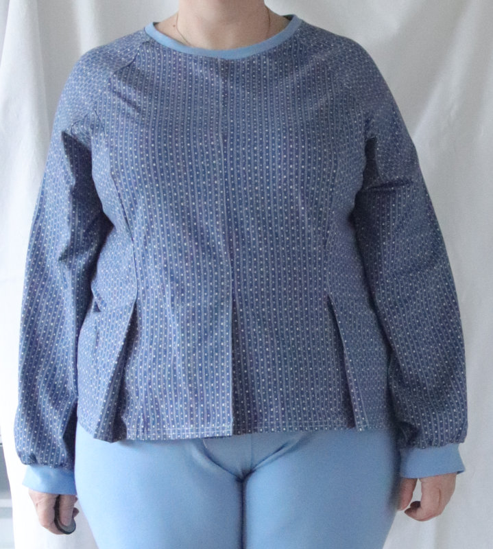 Gekauft habe ich mir den Schnitt, um mal etwas schönere Oberteile für den Sport zu bekommen. Die gekauften sind nutzbar, aber halt weder auf große Oberweite ausgelegt, noch auf breite Hüften. Oder Säcke. (Und wenn dein Sport „Tanzen“ ist, siehst du dich auch ständig im Spiegel…) Dieser Schnitt hat vorne Wiener Nähte (und hinten entsprechend geformte Teilungsnähte) die dann in bequeme Raglanärmel hinein laufen. Und damit es unten am Saum nicht so langweilig wird, sind noch Falten in die Teilungsnähte gearbeitet sowie eine Falte in der vorderen Mitte.