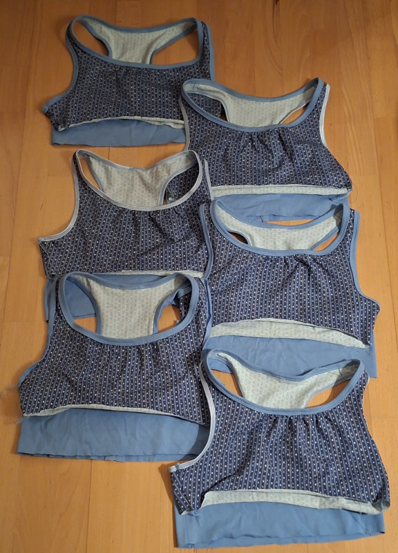 Da in dem Alter der dortigen „Kundinnen“ vermutlich eher Bedeckung als Halt gefragt ist, habe ich meinen BW-Elasthan-Jersey vom Schlafanzug genommen, in meinen alten „Meine Nähmode“ einen Simplicity-Schnitt für ein Bustier in Größe 36 gefunden und einfach mal geschaut, wie weit die Reste reichen. Zum Einfassen musste ich teilweise auf Falzgummi zurückgreifen, da hat der hellblaue Trigemajersey nicht mehr gereicht.