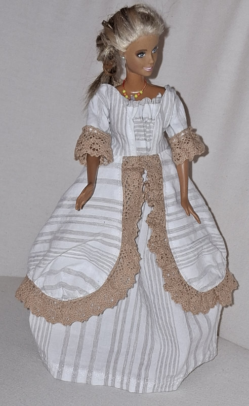 Die Reste meines Nachthemds durften jetzt auch Barbie bekleiden. Fertig ist es auch schon länger, wie man meinem aktuellen Monatsüberblick entnehmen kann. Da ich Stoff und Schnitte ja nach dem Zufallsprinzip matche, haben wir jetzt eine Rokoko-Prinzessin in einem natürlichen Look.